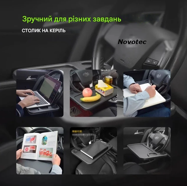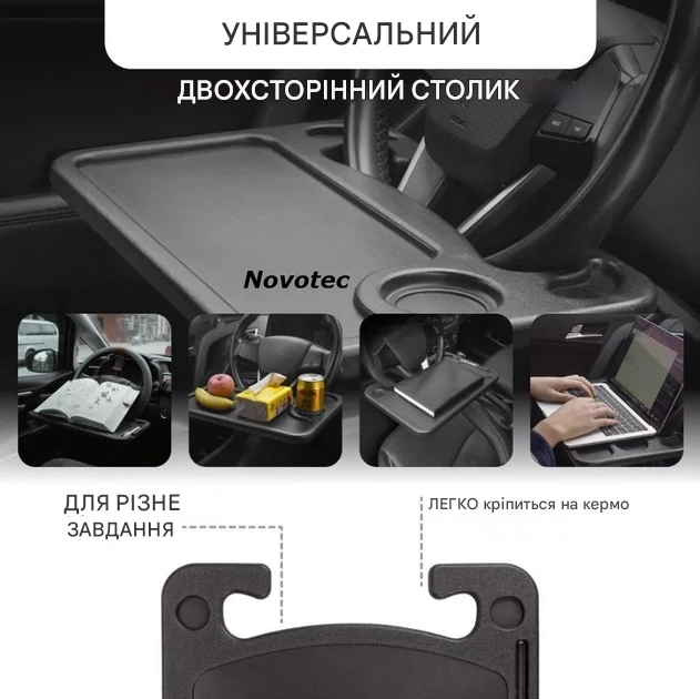 🔁 Двосторонній дизайн — з одного боку робоча поверхня для ноутбука чи паперів, з іншого — місце для їжі та напоїв. Підходить для будь-якої марки автомобіля.